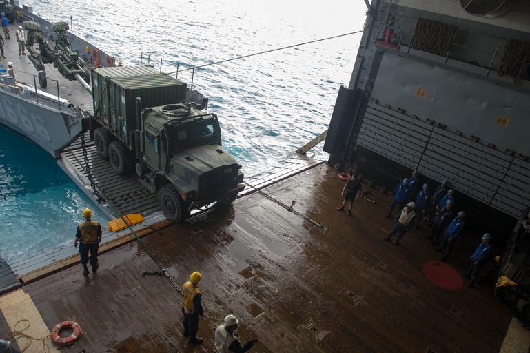| Keywords: Sailors and Marines load supplies 140203-N-IC565-475.jpg en Sailors and Marines load supplies from a landing craft utility vehicle into the lower vehicle area of the Austin-class amphibious transport dock ship USS Denver LPD 9 Denver is assigned to the Bonhomme Richard Amphibious Ready Group and is conducting operations in the U S 7th Fleet area of responsibility U S Navy photo by Mass Communication Specialist 3rd Class Bradley J Gee/Released 2014-02-03 Petty Officer 3rd Class Bradley Gee https //www dvidshub net/image/1161402 140203-N-IC565-475 2014-02-04 19 26 OKINAWA JP PD-USGov-Military-Navy USS Denver LPD-9 Images from DoD uploaded by Fæ |