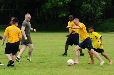 Keywords: Sailors and Marines play football with children in Thailand 110504-N-IC111-632.jpg en Sailors and Marines assigned to the aircraft carrier USS Ronald Reagan play soccer with children from the Youth Football Home during a community service project Ronald Reagan is currently anchored in Makham Bay Thailand for a scheduled port visit Photo by Petty Officer 3rd Class Kevin B Gray 2011-05-04 Kevin Gray https //www dvidshub net/image/397706 110504-N-IC111-632 2011-05-05 01 04 THALANG PHUKET TH PD-USGov-Military-Navy USS Ronald Reagan CVN-76 Images from DoD uploaded by Fæ |