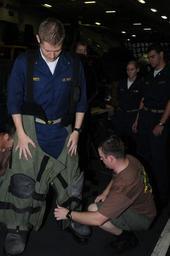 | Keywords: Sailors, midshipmen experience gear, weapons DVIDS178334.jpg en An explosive ordnance disposal technician helps Midshipman Bradford Barrett into a bomb suit during an EOD demonstration in the hangar bay of the aircraft carrier USS Ronald Reagan EOD Technicians can handle chemical biological and radiological threats and are one of the few military force that can both parachute from the air to reach distant targets or dive under the sea to disarm weapons Ronald Reagan is on a routine deployment to the Western Pacific 2009-06-09 Petty Officer 3rd Class Torrey Lee https //www dvidshub net/image/178334 090609-N-+++++-471 2009-06-09 09 24 USPACOM AT SEA PD-USGov-Military-Navy USS Ronald Reagan CVN-76 Images from DoD uploaded by Fæ |
