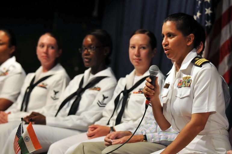| Keywords: Sailors visit India DVIDS380349.jpg en Cmdr Shanti Sethi commanding officer of the Arleigh Burke-class guided-missile destroyer USS Decatur answers question from female students from various city colleges and high schools to commemorate Women's History Month Sethi brought along eight female sailors from Decatur to participate in the interaction with the students in Chennai India Decatur's port visit to Chennai is part of a routine deployment conducting maritime security operations in the 7th Fleet area of responsibility 2011-03-17 Petty Officer 1st Class Jennifer Villalovos https //www dvidshub net/image/380349 110317-N-+++++-445 2011-03-21 17 45 CHENNAI IN PD-USGov-Military-Navy Women's History Month Images from DoD uploaded by Fæ |