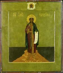 | Keywords: Saint Catherine (Russia, 19th c., Hillwood museum).jpg St Catherine The holy great martyr St Catherine stands on a rocky promentory against a ground of olive green and dark brown She holds an eight-pointed martyr's cross in her right hand and from her left is suspended an unfurled scroll with the inscription O Lord God hear me grant him who remembers the name of Catherine forgiveness of sins She wears a royal crown on her head and a green mantle over a wine red robe with royal bands of gold down the front around her waist and bordering the cuffs yoke and hem A plain gold halo surrounds her head Directly above her on the top polia is the image of Christ Not Made by Hands The inscription Holy Martyr St Catherine is written in gold just above the saint's head The board has a carved luzga and a red filenka http //www hillwoodmuseum org/collection/item/54 86 r /collection/search s Catherine 20II 20as 20Minerva p 4 19 c 19 Art from Russia in Hillwood Museum Files uploaded by Shakko from various sources Icons of Saint Catherine PD-old |