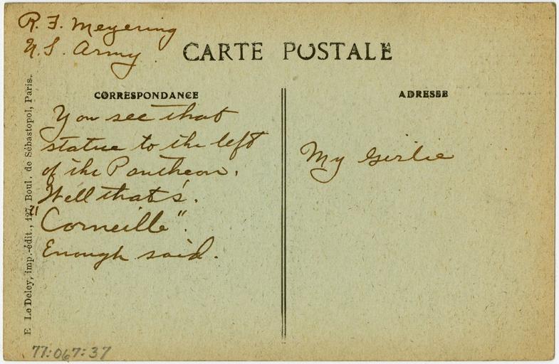 Keywords: george_eastman_house georgeeastmanhouse armistice day armisticeday soldiers mail soldiersmail r.j. meyering rjmeyering corporal my girlie mygirlie carte postale cartepostale post card postcard paris color:rgb_avg=bbb488 color:rgbavg=bbb488 text document writing Accession Number: 1977:0067:0037v Maker: Unidentified Photographer Title: Saint Etienne du Mont Church and Pantheon Date: ca. 1916 Medium: collotype print Dimensions: Overall: 9 x 13.9 cm George Eastman House Collection General – information about the George Eastman House Photography Collection is available at www.eastmanhouse.org/inc/collections/photography.php. For information on obtaining reproductions go to: www.eastmanhouse.org/flickr/index.php?pid=1977:0144:0050MP. Accession Number: 1977:0067:0037v Maker: Unidentified Photographer Title: Saint Etienne du Mont Church and Pantheon Date: ca. 1916 Medium: collotype print Dimensions: Overall: 9 x 13.9 cm George Eastman House Collection General – information about the George Eastman House Photography Collection is available at www.eastmanhouse.org/inc/collections/photography.php. For information on obtaining reproductions go to: www.eastmanhouse.org/flickr/index.php?pid=1977:0144:0050MP. |