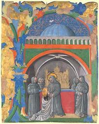 | Keywords: Saint Francis receives Clare of Assisi into the order of the minorites.jpg Klara von Assisi wird vom Heiligen Franziskus in den Orden der Minoriten aufgenommen Clare of Assisi is received into the order of the minorites by St Francis Св Ф анциск п инимает Кла у Ассизскую в о ден мино итов Mittelalterliche Buchmalerei Medieval illumination С едневековая миниатю а ~ 1435 unbekannt unknown неизвестен PD-old Paintings of Saint Clare of Assisi Life of Francis of Assisi Miniatures of Francis of Assisi 15th-century illuminated manuscripts |