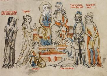 | Keywords: Saint Hedwig's family.jpg Saint Hedwig's family from Legend of Saint Hedwig in the center sit Hedwig of Andechs and Henry I the Bearded from left stand Gertrude Agnes Henry II the Pious Boleslaus at the bottom sit Sophia i Conrad the Curly Rodzina św Jadwigi z Legendy świętej Jadwigi pośrodku siedzą św Jadwiga i Henryk I Brodaty od lewej stoją Gertruda Agnieszka Henryk II Pobożny Bolesław na dole siedzą Zofia i Konrad Kędzierzawy http //www kulturwerk-schlesien de/storage/pic/geschichte/artikel2/579_bild3 jpg 14<sup>th</sup> century Creator Mikołaj Pruzia PD-art thumb Henry I of Poland in miniature Henry II of Poland in miniature Konrad the Curly Hedwig of Andechs MS LUDWIG XI 7 Getty museum - Hedwig Codex Google Art Project works by Court workshop of Duke Ludwig I the Fair Agnes of Poland Gertrude of Poland Abbess of Trebnitz Sophie of Poland Bolesław of Poland |