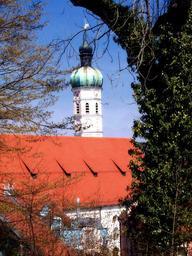 Keywords: saint jacob church building roof church tower overgrowed log red roof city