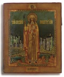 | Keywords: Saint Nino (Palekh, 20th c., priv.coll).jpg ST NINA OF GEORGIA RUSSIAN PALEKH SCHOOL 20TH CENTURY The young female martyr raising a cross and bringing a Book to her chest her hair loose on her shoulders dressed in an ochre robe and orange cape their volume rendered by gilt folds complemented by a white head cover; the hems of her garments and binding of her Book with opulent pearl and gem studded ornamentation the saint standing on a landscape with sparse vegetation on the opposite bank of the river the buildings of a town depicted in pastel colours against a greener scenery and blue skies; on the upper border the Mandylion; the decorative frame of the main image and the inscription below and the haloes of the saint and Christ emulating contemporary metal and enamelwork 11¾ x 10 in 29 8 x 25 4 cm http //www christies com/lotfinder/lot/st-nina-of-georgia-russian-20th-5152502-details aspx 20 c 20 Icons of saint Nino Files uploaded by Shakko from various sources Images from Christie's Private collections of Russian art Icons of Palekh PD-old |