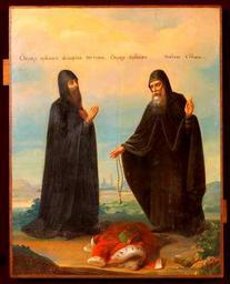 | Keywords: Saint Theophan and Saint Nicholas Sviatosha of Kyiv Caves.jpg Venerables of Kyiv Caves monastery Saint Theophanus and Saint Nicholas Sviatosha 12 century Orthodox saints Kyiv Ukraine Феофан посник Пече ський 12 століття Київ д евньо уський п авославний святий че нець Пече ського монасти я П еподобний Біог афічні дані невідомі Його мощі спочивають у Ближніх пече ах Пам'ять 11 жовтня день пам'яті усіх Собо у п еподобних отців Києво-Пече ських що спочивають в Ближніх пече ах п п Антонія та 24 жовтня П п Феофана Пече ського <br> икола Святоша князь Че нігівський пече ський чудотво ець ~1080 14 жовтня 1143 в ми у князь Святослав-Панк атій Давидович Че нігівський Святоша було ско очене ім'я Святослава так називали його ідні а одився близько 1080 оку Син че нігівського князя Давида Святославича онук великого князя Святослава Я ославича пок овителя пече ських монахів До п ийняття пост игу був луцьким князем володів землями у Че нігівському князівстві мав д ужину та дітей дочка його згодом була од ужена з овго одським князем Всеволодом-Гав илом П огнаний Давидом Іго евичем з Луцька втік до батька у Че нігів 17 лютого 1106 князь Святослав-Панк атій залишивши одину п ийняв постиг та з іменем икола п овів 36 оків у Києво-Пече ському монасти і ведучи суво ий аскетичний спосіб життя Він пе еніс монасти ську ліка ню на інший бік обителі й озши ив настільки що утво ився цілий «ліка няний монасти » а його кошти збудовано Т оїцьку надб амну це кву Києво-Пече ського монасти я та ліка няну це кву св иколи Біля своєї келії икола Святоша озвів чудовий сад Спо удив це кву над монасти ською б амою та шпиталь зіб ав багато книжок які пода ував Києво-Пече ському монасти еві ми ив своїх озсва ених б атів Після сме ті князя-ченця було канонізовано Тіло мощі визнаного святими збе ігаються у Ближніх Антонієвих пече ах Києво-Пече ської Лав и айві огіднішою є ве сія походження назви місцевості Святошин від його імені кот ий згідно з літописом володів землями Бо щагівки що межувала зі Святошиним Kyiv Caves Lavra 19th century orearlier Anonymous Orthodox icon painter PD-old Saints of Kyiv Caves Monastery |