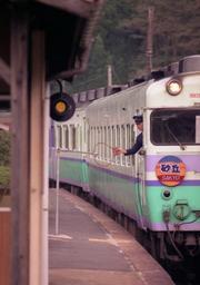 Keywords: Sakyu 1993 Passing a Station1.JPG en JR West Sakyu Express passing a station ja タブレット 過交換中の 行砂丘 own Hahifuheho 1993-10 cc-zero Sakyu train