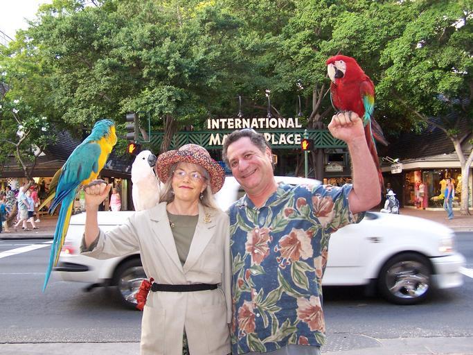 Keywords: Sal and Sharon Maccarone.JPG en Sal and Sharon Maccarone with parrots outside International Market Place Kalakaua Avenue Honolulu Hawaii USA There is a Blue-and-yellow Macaw Ara ararauna on the left a Red-and-green Macaw Ara chloropterus on the right and a Salmon-crested Cockatoo Cacatua moluccensis perching on the woman's shoulder own Faukina 2006-10-11 People with Psittaciformes Ara ararauna captive Ara chloropterus captive Cacatua moluccensis in zoos |