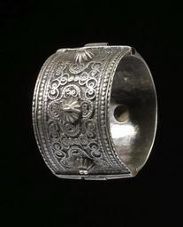 | Keywords: Salim - Bracelet - Walters 572316 - View B.jpg The bracelet is made of two equal halves and has three serrated halfglobules on each side The decoration combines spirals and circles; a triple bead-molded band frames the décor Inside of the bracelet is an engraved inscription in Hebrew which names the silversmith in Hebrew Sa lim xxx century 19 silver cast remains of green glass Outer diam cm 5 2 ; Inner diam 1 15/16 x W 1 7/16 in 4 9 x 3 7 cm accession number 57 2316 80920 Mr Benjamin Zucker Zucker Family Trust and Mr Derek Content New York and London by purchase Walters Art Museum Joint gift to the Walters Art Museum Baltimore and the Israel Museum Jerusalem by Mr Benjamin Zucker and Mr Derek Content in honor of Mrs Barbara Zucker and Mrs Amanda Content 2010 Engraving Hebrew Sa lim xxx place of origin northern Yemen Walters Art Museum license Jewellery in the Walters Art Museum South Arabian art in the Walters Art Museum Salim silversmith Media contributed by the Walters Art Museum needs category review |