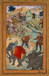 | Keywords: Salim Kills Rhinoceros and a Lion.jpg Salim Kills Rhinoceros and a Lion c 1600-04 Folio from a Shikarnama Hunting Album Held by The Chester Beatty Library Dublin Salim's Hunting Book In 50 1 Source This painting though in different borders was once part of a Shikarnama an album of images of the hunt presumably compiled for the Mughal prince Salim the future emperor Jahangir A shikari hunt attendant holds up the head of a dead lioness for the prince to inspect while in the foreground is a pile of at least four dead rhinoceros indicating that this must have been an especially successful hunt In the background is a pile of dead antelope and around them a group of shikaris most of whom are looking or gesturing towards the cheetah on the other side of the stream that has just brought down yet another antelope 1600-04 http //warfare2 likamva in/Moghul/17thC/Moghul_17thC htm author PD-old-100 Paintings of Jahangir Uploaded with VicuñaUploader Rhinoceros hunting Hunting by cheetah |