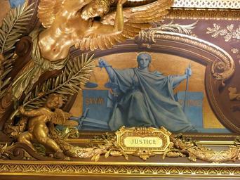 | Keywords: Salle d'assemblée générale du Conseil d'État - Justice.jpg en Hall of general assembly of the Conseil d'État in Palais Royal Paris France Medallion ceramics and painting about Justice The inscription Suum civique means Its citizens fr Salle d'assemblée générale du Conseil d'État au Palais Royal Paris Médaillon céramiques et peintures de la Justice L'inscription Suum civique signifie Ses citoyens sf 2014-09-21 Tangopaso Conseil d'État - salle d'assemblée générale Paintings by Jules-Élie Delaunay Allegories of justice Latin inscriptions in Paris Suum cuique |
