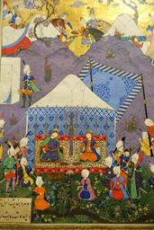 | View Original: | Salm and Tur receive the reply of Faridun and Manuchihr, folio from Shahnameh of Shah Tahmasp, attrib. 'Abd al-'Aziz, Iran, Tabriz, c. 1522-1535 AD, view 2 - Aga Khan Museum - Toronto, Canada - DSC06923.jpg (-3648x5472) | |||
