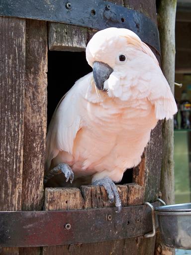 Keywords: salmon-crested cockatoo cacatua moluccensis moluccan cockatoo bird pink coral beak parrot feathers close-up barrel bird house claw