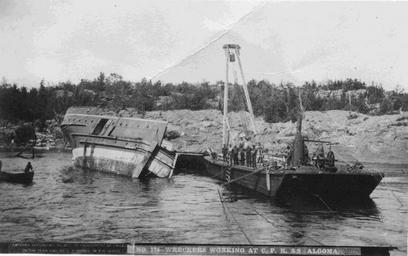 | Keywords: lake superior lakesuperior ships shipwrecks salvage algoma s.s. algoma ssalgoma steamers steamship cpr canadian pacific railway canadianpacificrailway isle royale isleroyale ontario canada history blackandwhite monochrome outdoor black and white Date: November 1885 Description: On 6 November 1885, blinding snow squalls forced the CPR steamship Algoma, en route to Port Arthur, to seek the shelter of Isle Royale. Just after 5:00am the next day the captain heard the blare of a fog horn and ordered "hard to starboard" but to no avail as the ship struck a reef broadside at Greenstone Point. Huge rollers swept her decks clean and crushed her lifeboats while crashing her stern down repeatedly upon the rocky shelf. Many people were victims of the waves and others were sucked down when the bow broke off and disappeared. Survivors on the stern tried to swim to the shore, a tantalizing 18 metres away, but only three made it. The rest spent almost two full days on the wreck before the storm let up. Of the 60 aboard, only 23 survived making this the largest loss of life in Superior’s history. Tragically for the CPR, the Algoma sank on the same day the railway's last spike was driven in the Rockies. Divers located the wreck in 1978. This photograph depicts the crew attempting to salvage what they can of the ship and its contents. Photo by J.K. Cooke. Accession No.: 983.29.19 A Date: November 1885 Description: On 6 November 1885, blinding snow squalls forced the CPR steamship Algoma, en route to Port Arthur, to seek the shelter of Isle Royale. Just after 5:00am the next day the captain heard the blare of a fog horn and ordered "hard to starboard" but to no avail as the ship struck a reef broadside at Greenstone Point. Huge rollers swept her decks clean and crushed her lifeboats while crashing her stern down repeatedly upon the rocky shelf. Many people were victims of the waves and others were sucked down when the bow broke off and disappeared. Survivors on the stern tried to swim to the shore, a tantalizing 18 metres away, but only three made it. The rest spent almost two full days on the wreck before the storm let up. Of the 60 aboard, only 23 survived making this the largest loss of life in Superior’s history. Tragically for the CPR, the Algoma sank on the same day the railway's last spike was driven in the Rockies. Divers located the wreck in 1978. This photograph depicts the crew attempting to salvage what they can of the ship and its contents. Photo by J.K. Cooke. Accession No.: 983.29.19 A |