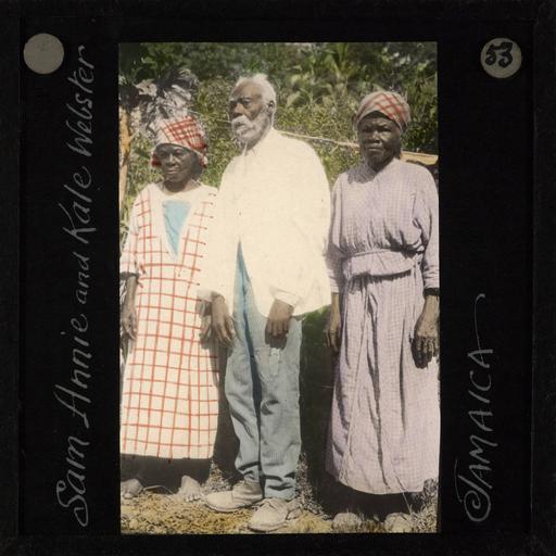 Keywords: Sam, Annie and Kate Webster, Jamaica, ca.1875-ca.1940 (imp-cswc-GB-237-CSWC47-LS11-053).jpg en <br> Sam Annie and Kate Webster Jamaica ca 1875-ca 1940 Sam Annie and Kate Webster Photograph of an elderly Jamaican man and two elderly Jamaican women The three are likely to be siblings ; This belongs to a series of Church of Scotland Foreign Missions Committee lantern slides relating to Jamaica In 1800 the Scottish Missionary Society sent three missionaries to Jamaica Two died of yellow fever within weeks of arrival but the third became a pioneer missionary In 1824 a second venture travelled to Jamaica by invitation of local planters to instruct their slaves Scottish missionaries worked at Montego Bay in the 19th century and in 1836 the first presbytery of the Jamaican Church was constituted here Photographer Unknown Filename imp-cswc-GB-237-CSWC47-LS11-053 tif Coverage date circa 1875/1940 Part of collection International Mission Photography Archive ca 1860-ca 1960 Type images Part of subcollection Photographs from the Centre for the Study of World Christianity University of Edinburgh U K ca 1900-ca 1940s Repository name Centre for the Study of World Christianity Archival file impaunpub_Volume7/1828 url Repository address The University of Edinburgh School of Divinity New College Mound Place Edinburgh EH1 2LX United Kingdom Geographic subject country Jamaica Format aacr2 1 lantern slide 8 x 8 cm Geographic subject continent North and Central America Rights Contact the repository for details Part of series Jamaica LS11 Repository email divinity-CSWC ed ac uk Subject lcsh Keyword Families Date created circa 1875/1940 Publisher of the digital version University of Southern California Libraries Subject aat genre group portraits Format aat lantern slides Legacy record ID impa-m69407 Access conditions http //www ed ac uk/schools-departments/divinity/research/centres/world-christianity/collections-resources File GB 237 CSWC47/LS11/53 circa 1875 /1940 date created author http //digitallibrary usc edu/cdm/ref/collection/p15799coll123/id/64944 PD-old-70-1923 Magic lantern images Images from USC Digital Library uploaded by Fæ International Mission Photography Archive ca 1860-ca 1960 |