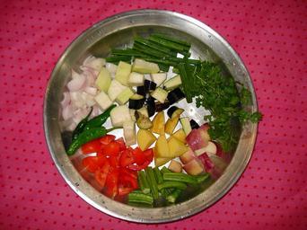 Keywords: Sambar Vegetables.JPG en These are prepared vegetables for Sambar dish own Miansari66 Cuisine of Pakistan Cuisine of Sri Lanka Cuisine of Tamil Nadu Sambar dish Food ingredients in Indian cuisine Food preparation in India