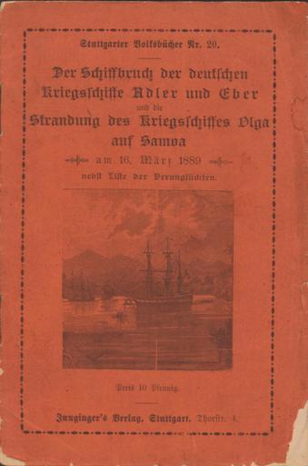 Keywords: Samoa.JPG de Der Schiffbruch der deutschen Kriegsschiffe Adler und Eber und die Strandung des Kriegsschiffes Olga auf Samoa am 16 März 1889 nebst Liste der Verunglückten Junginger's Verlag Stuttgart Thorstr 4 Stuttgarter Volkerbücher 20 16 Seiten Beschreibung des Unglücks 3 Seiten Liste der Opfer nach Name Rang und Herkunft of the accident 3 pages list of victims by name rank and origin Scan des Covers eines Buches im eigenen Besitz Volkerj 2011-12-30 Cc-zero SMS Eber ship 1887 Olga ship 1881 1889 works Adler ship 1883 History of Samoa Red cover books |