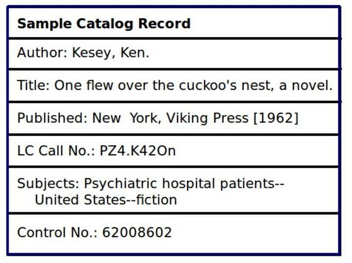 | Keywords: Sample Catalog Record.png  text en In library science the card catalog would contain a record such as this one for a particular book As bibliographic information went online these were replaced by databases and were searchable electronically 2012-11-25 20 09 19 own Tomwsulcer Source Karen Calhoun of the Cornell University Library in http //researcharchive calacademy org/research/informatics/taf/proceedings/Calhoun html A Bird's Eye View of Authority Control in Cataloging cc-zero Uploaded with UploadWizard Library and information science |