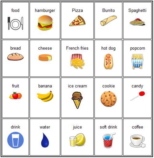 | Keywords: Sample page from AAC communication book.png en Self-made sample page from a low-tech w Augmentative and alternative communication aid 2011-08-21 own Quadell I created this work by combining many images on Commons The individual images are each released under the following license or under a less restrictive license cc-by-sa-3 0 To reuse this image you will have to abide by the most restrictive terms of the individual images used I claim no copyright on the composition itself cc-zero The images used are as follows File Gatunek jadalny black line svg File SRD fastfood menue 1 svg File Cheese pizza svg File Burrito svg File Pastasciutta JPG File Jean victor balin bread svg File Cheese svg File French fries icon png File Hot dog icon png File Popcorn icon png File Fruit svg File Bananas svg File ConodeheladodeClubPenguin jpg File Crystal Project cookie png File Jonata Lollipop svg File Maximaal alcoholpromillage logo svg File Water drop svg File Tango-juice svg File Soft drink icon png File Applications-ristretto svg Uploaded with UploadWizard Augmentative and alternative communication Pizza icons Hamburger icons Popcorn icons Cheese icons Banana icons Ice cream icons Cookie icons Lemon icons Drink icons French fries icons Hot dog icons Burrito icons Bread icons Candy icons Coffee and tea icons Spaghetti icons Fruit icons |