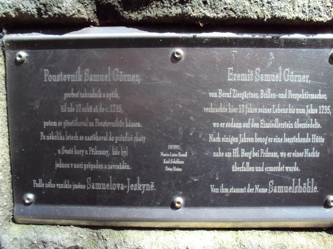 Keywords: Samuel 3.jpg cs Infodestička v Samuelově jeskyni nad Sloupem v Čechách Text Poustevník Samuel Görner profesí zahradník a optik žil zde 17 roků až do r 1735 potom se přestěhoval na Poustevníkův kámen Po několika letech se nastěhoval do prázdné chaty u Svaté hory u Příbramy kde byl jednou v noci prěpaden a zavražděn Podle něho vzniklo jméno Samuelova-Jeskyně <br /> Eremit Samuel Görner von Beruf Ziergärtner Brillen- und Perspektivmacher verbrachte hier 17 Jahre seines Lebens bis zum Jahre 1735 wo er sodann auf den Einsiedlerstein übersiedelte Nach einigen Jahren bezog er eine leerstehende Hütte nahe am Hl Berg bei Pribram wo er eines Nachts überfallen und ermordet wurde Von ihm stammt der Name Samuelshöhle <br /> 10/2001 Marie-Luise Krauß Karl Schiffner Peter Heinz own Zákupák 2010-09-01 Samuelova jeskyně Plaques in Česká Lípa District Bilingual plaques in the Czech Republic Plaques referencing 1735 Plaques installed in 2001 |