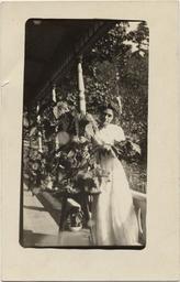 Keywords: Woman standing beside potted begonias on porch, message from Rosa to Alice on back