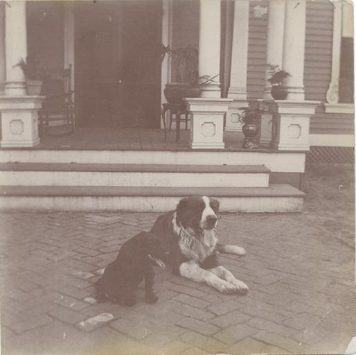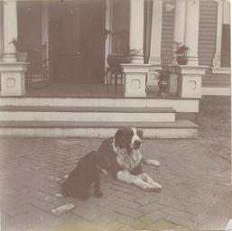 Keywords: Lala Long's dogs "Brandy" & "Skipper" (small dog) front of porch of house, 1895
