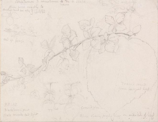 Keywords: Samuel Palmer - Brambles - Google Art Project.jpg Inscribed in artist's hand in graphite upper left Sometimes 3 sometimes 5 on a stalk leaves These were mostly 4 Another kind has only 3 LEAVES ; in artist's hand in graphite upper right oak hedge ; in artist's hand in graphite center left end of bough ; in artist's hand in graphite lower left BRIAR Blackberry plant Stalk towards end of light ; in artist's hand in graphite lower center lying flat size A ; in artist's hand in graphite lower right Traced round from largest leaf ground plan Fibers clearly projecting on under side of leaf Inscription _Signed_and_Dated Not signed not dated Not on View Graphite on white slightly textured laid paper briar blackberry plant still life special url_id 2gEOv-SIQ254HQ PD-old-100-1923 1881 Drawings by Samuel Palmer Google Art Project works by Samuel Palmer |