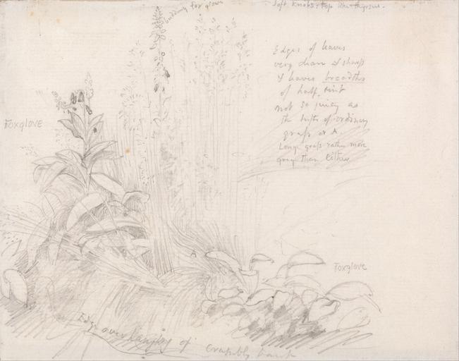 | Keywords: Samuel Palmer - Foxgloves - Google Art Project.jpg Inscribed in artist's hand in graphite upper center budding fox glove ; in artist's hand in graphite upper right Soft knobs Top like thyrsus ; in artist's hand in graphite center left Foxglove ; in artist's hand in graphite center right Edges of leaves very clean sharp and leaves breadths of half tint no so juicy as the tufts of ordinary grass at A Long grass rather more grey than either ; in artist's hand lower center Edge overhanging of crumbly tank ; in artist's hand in graphite lower right Foxglove ; inscribed on back in graphite center Fox Glove 1678 With Grasses Toys Hill July 55 Inscription _Signed_and_Dated Not signed not dated Not on View Graphite on medium smooth white laid paper foxgloves flowers sketch still life special url_id KwELEGyxoACAEg PD-old-100-1923 1881 Drawings by Samuel Palmer Google Art Project works by Samuel Palmer |