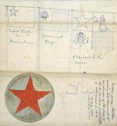 | Keywords: Samuel Reid proposed U.S. Flag designs.jpg Sketches made by Samuel Chester Reid in 1850 in a letter to his son showing his proposed designs for various U S flags when he was a central part of Congressional discussions in 1817 Reid came up with the concept of having 13 stripes while adding stars to represent the states which was the definition chosen for the Flag Act of 1818 which is still in force today Reid recommended arranging the stars in a larger star which in fact was used in the first flag flown over the Capitol following the 1818 law but shortly thereafter horizontal rows became customary Reid actually proposed three flags the people's flag a governmental flag with the stars replaced by the coat of arms so to better distinguish merchant from government ships and a national standard to be used on ceremonial occasions such as inaugurations This last flag was reminiscent of the British royal standard and had four quarters one with the stars on a blue background another with the coat of arms on a white background another with the Goddess of Liberty on a white background and the last with the 13 red and white stripes Other accounts of the Congressional committee letters show the eagle and goddess quarters switched from this sketch; perhaps they were changed in discussions before being dropped altogether Reid also proposed a national cockade a symbol worn on military uniforms None of Reid's additional suggestions were adopted nor were they seriously considered Text Peoples flag for Merchantmen Government flag Standard of the unions National cockade Letter from Father giving his account of his design of the flag of the U States as adopted by Congress in 1818 17 Feb 1850 http //www loc gov/exhibits/treasures/trm098 html direct image URL http //www loc gov/exhibits/treasures/images/vc26 7p4 jpg Library of Congress Manuscript Division 26 7 page 4 1850-02-17 Samuel Chester Reid File Samuel Reid proposed national standard jpg PD-old Historical flags of the United States Proposed flags Cockades of the United States |