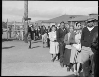 | Keywords: San Bruno, California. Supper time^ Meal times are the big events of the day within an assembly ce . . . - NARA - 537932.jpg Scope and content The full caption for this photograph reads San Bruno California Supper time Meal times are the big events of the day within an assembly center This is a line-up of evacuees waiting for the B shift at 5 45 pm They carry with them their own dishes and cutlery in bags to protect them from the dust They themselves individually wash their own dishes after each meal since dish washing facilities in the mess halls proved inadequate Most of the residents prefer this second shift because they sometimes get second helpings but the groups are rotated each week There are eighteen mess halls in camp which together accomodate 8 000 persons three times a day All food is prepared and served by evacuees General notes 537932 Local identifier 210-G-C632 Department of the Interior War Relocation Authority 02/16/1944 - 06/30/1946 NARA-Author Lange Dorothea 1895-1965 Photographer 1372774 <br /> Still Picture Records Section Special Media Archives Services Division NWCS-S National Archives at College Park 8601 Adelphi Road College Park MD 20740-6001 1942-06-16 Record group Record Group 210 Records of the War Relocation Authority 1941 - 1989 Record group ARC 537 Central Photographic File of the War Relocation Authority compiled 1942 - 1945 Series ARC 536000 File unit File unit ARC Variant control numbers NAIL Control Number NWDNS-210-G-C632 Other versions <gallery> File San_Bruno _California _Supper_time _Meal_times_are_the_big_events_of_the_day_within_an_assembly_ce_ _ _ _-_NARA_-_537932 tif tif File San_Bruno _California _Supper_time _Meal_times_are_the_big_events_of_the_day_within_an_assembly_ce_ _ _ _-_NARA_-_537932 jpg jpg </gallery> NARA-cooperation PD-USGov Dorothea Lange Tanforan Assembly Center |