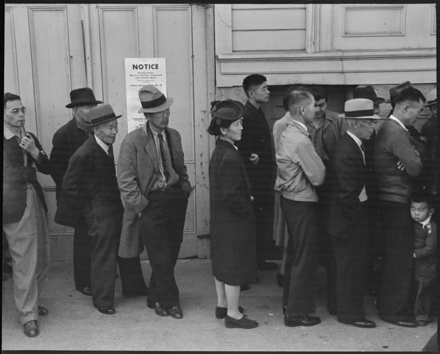 | Keywords: San Francisco, California. In response to the Army's Exclusion Order Number 20, residents of Japane . . . - NARA - 536408.jpg Scope and content The full caption for this photograph reads San Francisco California In response to the Army's Exclusion Order Number 20 residents of Japanese ancestry appear at Civil Control Station at 2031 Bush Street for registration The evacuees will be housed in War Relocation Authority centers for the duration General notes 536408 Local identifier 210-G-A516 Department of the Interior War Relocation Authority 02/16/1944 - 06/30/1946 NARA-Author Lange Dorothea 1895-1965 Photographer 1372774 <br /> Still Picture Records Section Special Media Archives Services Division NWCS-S National Archives at College Park 8601 Adelphi Road College Park MD 20740-6001 1942-04-25 Record group Record Group 210 Records of the War Relocation Authority 1941 - 1989 Record group ARC 537 Central Photographic File of the War Relocation Authority compiled 1942 - 1945 Series ARC 536000 File unit File unit ARC Variant control numbers NAIL Control Number NWDNS-210-G-A516 Other versions <gallery> File San_Francisco _California _In_response_to_the_Army's_Exclusion_Order_Number_20 _residents_of_Japane_ _ _ _-_NARA_-_536408 tif tif File San_Francisco _California _In_response_to_the_Army's_Exclusion_Order_Number_20 _residents_of_Japane_ _ _ _-_NARA_-_536408 jpg jpg </gallery> NARA-cooperation PD-USGov Dorothea Lange Japanese American internment processing in San Francisco |