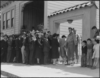 | Keywords: San Francisco, California. Japanese family heads and persond living alone, form a line outside Civi . . . - NARA - 536422.jpg Scope and content The full caption for this photograph reads San Francisco California Japanese family heads and persond living alone form a line outside Civil Control Station located in the Japanese American Citizens League Auditorium at 2031 Bush Street to appear for processing in response to Civilian Exclusion Order Number 20 General notes 536422 Local identifier 210-G-A530 Department of the Interior War Relocation Authority 02/16/1944 - 06/30/1946 NARA-Author Lange Dorothea 1895-1965 Photographer 1372774 <br /> Still Picture Records Section Special Media Archives Services Division NWCS-S National Archives at College Park 8601 Adelphi Road College Park MD 20740-6001 1942-04-25 Record group Record Group 210 Records of the War Relocation Authority 1941 - 1989 Record group ARC 537 Central Photographic File of the War Relocation Authority compiled 1942 - 1945 Series ARC 536000 File unit File unit ARC Variant control numbers NAIL Control Number NWDNS-210-G-A530 Other versions <gallery> File San_Francisco _California _Japanese_family_heads_and_persond_living_alone _form_a_line_outside_Civi_ _ _ _-_NARA_-_536422 tif tif File San_Francisco _California _Japanese_family_heads_and_persond_living_alone _form_a_line_outside_Civi_ _ _ _-_NARA_-_536422 jpg jpg </gallery> NARA-cooperation PD-USGov Japanese American internment processing in San Francisco Japanese American Citizens League Dorothea Lange Queues in the United States |