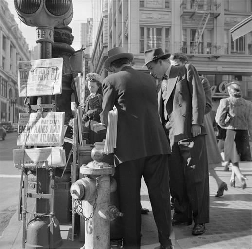 | Keywords: San Francisco Newspapers After Pearl Harbor Attack.jpg Corner of Montgomery and Market Streets Monday morning December 8 1941 after Japanese attack on Pearl Harbor San Francisco California Shows people looking at newspaper headlines Photo by John Collier via Library of Congress website http //www loc gov/pictures/item/fsa2000052846/PP/; high res TIF converted to jpg border cropped and contrast adjusted before uploading to Wikimedia Commons 1941-12-08 John Collier PD-USGov 1941 in San Francisco December 1941 in the United States Pearl Harbor attack Fashion in 1941 1941 newspapers Newspapers of San Francisco Fire hydrants in California 1941 photographs |