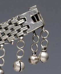 | Keywords: Sana - Necklace - Walters 572315 - Mark A.jpg The close-fitting necklace consists of a broad chain which combines square plaques with four-ball décor and originally green enamel and those with a flat gilded surface The basic motif of series has three vertical arranged plaques with and two without décor The ornament on the rectangular clasp combines a central rosette with double-volutes in the corners The necklace has thirty-three loops with thirty-two preserved pendants with ball-shaped dangles On the back of the clasp is an Arabic stamp with the name of the ruler al-Mansur Al-Mansur Ali I ruled from AH 1189 to 1224 AD 1775-1809 In addition there is the name of the silversmith engraved in Hebrew xxx Sana ani The first name of the silversmith is lost but it is mentioned that he and his family come from Sana a' 1189-1224 AH/AD 1775-1809 silver with gilding green enamel L 10 9/16 x W 5/8 in 26 9 x 1 6 cm accession number 57 2315 80919 Mr Benjamin Zucker Zucker Family Trust and Mr Derek Content New York and London by purchase Walters Art Museum Joint gift to the Walters Art Museum Baltimore and the Israel Museum Jerusalem by Mr Benjamin Zucker and Mr Derek Content in honor of Mrs Barbara Zucker and Mrs Amanda Content 2010 Stamp In Arabic al-Mansur; Engraved In Hebrew xxx San'ani place of origin Sana'a Yemen Walters Art Museum license Jewellery in the Walters Art Museum South Arabian art in the Walters Art Museum Sana'ani Media contributed by the Walters Art Museum needs category review |