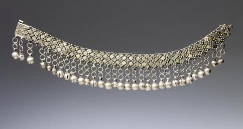 | Keywords: Sana - Necklace - Walters 572315.jpg The close-fitting necklace consists of a broad chain which combines square plaques with four-ball décor and originally green enamel and those with a flat gilded surface The basic motif of series has three vertical arranged plaques with and two without décor The ornament on the rectangular clasp combines a central rosette with double-volutes in the corners The necklace has thirty-three loops with thirty-two preserved pendants with ball-shaped dangles On the back of the clasp is an Arabic stamp with the name of the ruler al-Mansur Al-Mansur Ali I ruled from AH 1189 to 1224 AD 1775-1809 In addition there is the name of the silversmith engraved in Hebrew xxx Sana ani The first name of the silversmith is lost but it is mentioned that he and his family come from Sana a' 1189-1224 AH/AD 1775-1809 silver with gilding green enamel L 10 9/16 x W 5/8 in 26 9 x 1 6 cm accession number 57 2315 80919 Mr Benjamin Zucker Zucker Family Trust and Mr Derek Content New York and London by purchase Walters Art Museum Joint gift to the Walters Art Museum Baltimore and the Israel Museum Jerusalem by Mr Benjamin Zucker and Mr Derek Content in honor of Mrs Barbara Zucker and Mrs Amanda Content 2010 Stamp In Arabic al-Mansur; Engraved In Hebrew xxx San'ani place of origin Sana'a Yemen Walters Art Museum license Jewellery in the Walters Art Museum South Arabian art in the Walters Art Museum Sana'ani Media contributed by the Walters Art Museum needs category review |