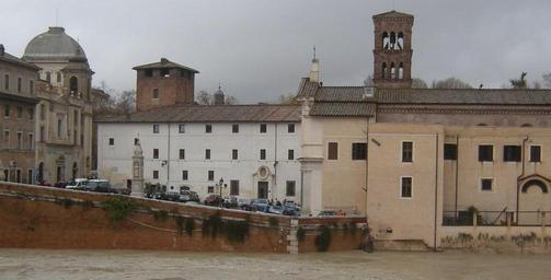 Keywords: SanBarlomeoRoma13Dec2008.jpg en San Bartolomeo church on the island Isola Tiberina on the river Tiber in Rome Italy during the flood of December 13 2008 Own Sherpes 2008-12-13 Isola Tiberina