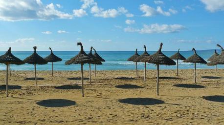 Keywords: sand beach beach sand sea coast nature parasols holiday mediteran mallorca balearic islands island spain travel clouds cloud formation shadow hispanic