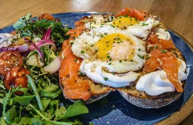 Keywords: sandwich salmon fried egg eggs salad meal menu eating food restaurant eat lunch nutrition fried dining buffet
