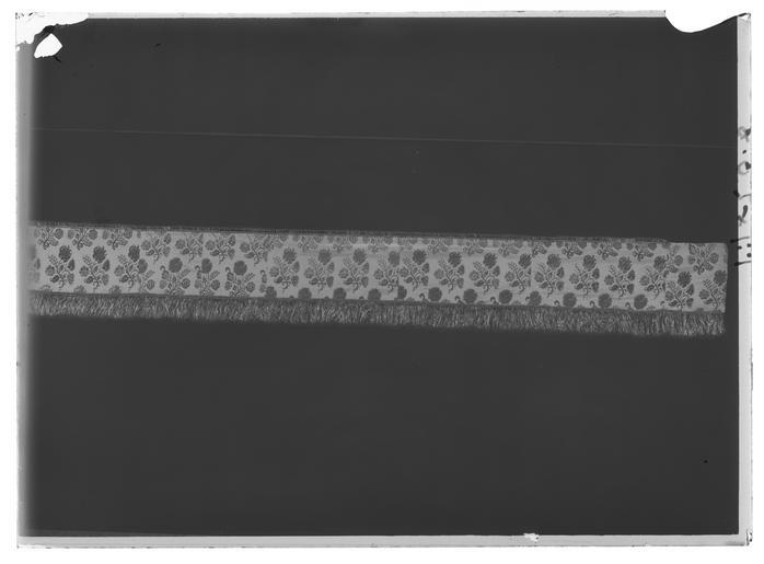 | Keywords: Sängomhänge, Torpa stenhus - Livrustkammaren - 36181-negative.tif LSH artwork sv Del av sängomhänge till stolpsäng Sängomhänget består av fyra våder De två yttre och en av mittvåderna är i benvitt siden med invävt mönster i form av stiliserade blommor i geometriska former Den andra mittvåden är av svart sidenatlas med invävda blomsterkvistar i gul cerise vit och grön silke Överst är den svarta våden lappad med en remsa i samma tyg Vit vådbredd ytterst 465 mm i mitten 225 mm Svart vådbredd 500 mm <br/>Franskant runt om långsidorna och nedre kortsidan av svart beige och vit silke bredd 18 mm <br/>Längs överkanten elva metallringar av vilka nio är av gul grövre metall med raka kanter Två är av vit metall Fästa med beigefärgat garn eller beige/svarta sidenband original caption silk Färg benvit vit d1 - dräkt - yttermaterial material siden - silk Färg svart gul cerise vit grön d1 - dräkt - yttermaterial material sidenatlas - silk Färg svart beige vit d4 - dräkt - passpoaler band kantning uppslag material silkesfrans - metal Färg gul vit d5 - dräkt - knappar och spännen material metall - yarn Färg beige d5 - dräkt - knappar och spännen material garn - silk Färg beige svart d5 - dräkt - knappar och spännen material sidenband g 560 size mm 1720 1690 LRK Himmelssängar place of origin original filename LN_B16494_019374 56192 inventory number LRK 19612 36181 CC0 Sängomhänge Torpa stenhus - Livrustkammaren - 36181 tif <gallery caption Different images of same object > File Sängomhänge Torpa stenhus - Livrustkammaren - 44739 tif File Sängomhänge Torpa stenhus - Livrustkammaren - 10496 tif File Sängomhänge Torpa stenhus - Livrustkammaren - 61861 tif File Sängomhänge Torpa stenhus - Livrustkammaren - 53300 tif File Sängomhänge Torpa stenhus - Livrustkammaren - 19058 tif File Sängomhänge Torpa stenhus - Livrustkammaren - 78982 tif File Sängomhänge Torpa stenhus - Livrustkammaren - 70423 tif File Sängomhänge Torpa stenhus - Livrustkammaren - 27620 tif </gallery> |