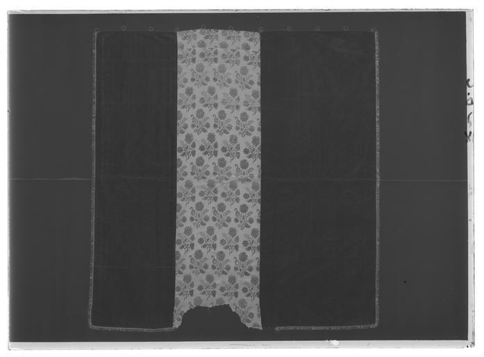 | Keywords: Sängomhänge, Torpa stenhus - Livrustkammaren - 61861-negative.tif LSH artwork sv Del av sängomhänge till stolpsäng Sängomhänget består av fyra våder De två yttre och en av mittvåderna är i benvitt siden med invävt mönster i form av stiliserade blommor i geometriska former Den andra mittvåden är av svart sidenatlas med invävda blomsterkvistar i gul cerise vit och grön silke Överst är den svarta våden lappad med en remsa i samma tyg Vit vådbredd ytterst 465 mm i mitten 225 mm Svart vådbredd 500 mm <br/>Franskant runt om långsidorna och nedre kortsidan av svart beige och vit silke bredd 18 mm <br/>Längs överkanten elva metallringar av vilka nio är av gul grövre metall med raka kanter Två är av vit metall Fästa med beigefärgat garn eller beige/svarta sidenband original caption silk Färg benvit vit d1 - dräkt - yttermaterial material siden - silk Färg svart gul cerise vit grön d1 - dräkt - yttermaterial material sidenatlas - silk Färg svart beige vit d4 - dräkt - passpoaler band kantning uppslag material silkesfrans - metal Färg gul vit d5 - dräkt - knappar och spännen material metall - yarn Färg beige d5 - dräkt - knappar och spännen material garn - silk Färg beige svart d5 - dräkt - knappar och spännen material sidenband g 560 size mm 1720 1690 LRK Himmelssängar place of origin original filename LN_B16497_019377 56192 inventory number LRK 19612 61861 CC0 Sängomhänge Torpa stenhus - Livrustkammaren - 61861 tif <gallery caption Different images of same object > File Sängomhänge Torpa stenhus - Livrustkammaren - 44739 tif File Sängomhänge Torpa stenhus - Livrustkammaren - 10496 tif File Sängomhänge Torpa stenhus - Livrustkammaren - 36181 tif File Sängomhänge Torpa stenhus - Livrustkammaren - 53300 tif File Sängomhänge Torpa stenhus - Livrustkammaren - 19058 tif File Sängomhänge Torpa stenhus - Livrustkammaren - 78982 tif File Sängomhänge Torpa stenhus - Livrustkammaren - 70423 tif File Sängomhänge Torpa stenhus - Livrustkammaren - 27620 tif </gallery> |