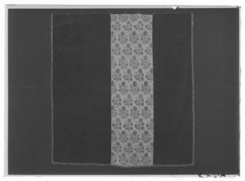 | Keywords: Sängomhänge, Torpa stenhus - Livrustkammaren - 53300-negative.tif LSH artwork sv Del av sängomhänge till stolpsäng Sängomhänget består av fyra våder De två yttre och en av mittvåderna är i benvitt siden med invävt mönster i form av stiliserade blommor i geometriska former Den andra mittvåden är av svart sidenatlas med invävda blomsterkvistar i gul cerise vit och grön silke Överst är den svarta våden lappad med en remsa i samma tyg Vit vådbredd ytterst 465 mm i mitten 225 mm Svart vådbredd 500 mm <br/>Franskant runt om långsidorna och nedre kortsidan av svart beige och vit silke bredd 18 mm <br/>Längs överkanten elva metallringar av vilka nio är av gul grövre metall med raka kanter Två är av vit metall Fästa med beigefärgat garn eller beige/svarta sidenband original caption silk Färg benvit vit d1 - dräkt - yttermaterial material siden - silk Färg svart gul cerise vit grön d1 - dräkt - yttermaterial material sidenatlas - silk Färg svart beige vit d4 - dräkt - passpoaler band kantning uppslag material silkesfrans - metal Färg gul vit d5 - dräkt - knappar och spännen material metall - yarn Färg beige d5 - dräkt - knappar och spännen material garn - silk Färg beige svart d5 - dräkt - knappar och spännen material sidenband g 560 size mm 1720 1690 LRK Himmelssängar place of origin original filename LN_B16496_019376 56192 inventory number LRK 19612 53300 CC0 Sängomhänge Torpa stenhus - Livrustkammaren - 53300 tif <gallery caption Different images of same object > File Sängomhänge Torpa stenhus - Livrustkammaren - 44739 tif File Sängomhänge Torpa stenhus - Livrustkammaren - 10496 tif File Sängomhänge Torpa stenhus - Livrustkammaren - 61861 tif File Sängomhänge Torpa stenhus - Livrustkammaren - 36181 tif File Sängomhänge Torpa stenhus - Livrustkammaren - 19058 tif File Sängomhänge Torpa stenhus - Livrustkammaren - 78982 tif File Sängomhänge Torpa stenhus - Livrustkammaren - 70423 tif File Sängomhänge Torpa stenhus - Livrustkammaren - 27620 tif </gallery> |