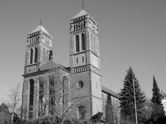 | Keywords: Sankt Pirminius quer blackwhite.jpg The picture shows Sankt Pirminius church in Pirmasens Germany It is a clear day in February 2008 Zur Landgrafenzeit stand 1770 auf dem oberen Schlossplatz in Pirmasens eine riesige Exerzierhalle Aus den Steinen dieser Halle entstand die erste kath Kirche 1896 abgerissen und durch eine Notholzkirche ersetzt 1900 wurde die jetzige Pirminiuskirche errichtet Own 2008-02 Akinom Sankt Pirminius Church in Pirmasens Germany | ||||