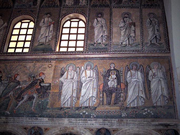 | Keywords: Sant'.Apollinare.Nuovo16.jpg Basilica of Sant'Apollinare Nuovo in Ravenna Italy Mary and Child surrounded by angels Mosaic of a Ravennate italian-byzantine workshop completed within 526 AD by the so-called Master of Sant'Apollinare Basilica di Sant'Apollinare Nuovo a Ravenna Maria col Bambino attorniata da angeli Mosaico di scuola ravennate italo-bizantina completato entro il 526 d C dal cosiddetto maestro di Sant'Apollinare own 2006-04-05 Georges Jansoone PD-Art GFDL Cc-by-sa-3 0-migrated Cc-by-2 5 Mosaic of Mary and the angels in Sant'Apollinare Nuovo Ravenna |