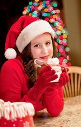 Keywords: santa woman christmas hot chocolate santa red hat woman happy holiday happiness cheerful smiling christmas woman