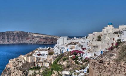 Keywords: santorini oia greece leisure travel summer greek tourism europe island mediterranean landscape culture famous building outdoor water vacation white architecture touristic village