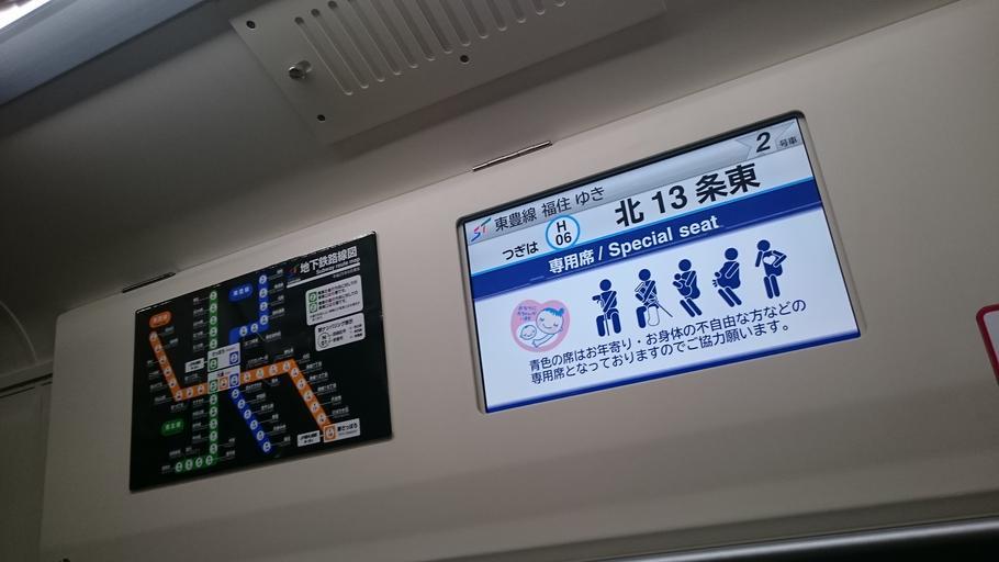 | Keywords: Sapporo 9000 LCD display (2) 20150513.JPG  en An LCD passenger information display inside Sapporo Municipal Subway 9000 series EMU set 9101 ja æ å¹Œå¸‚å–¶å °ä¸‹é‰„9000å½¢LCD 2015-05-13 18 31 05 ja File Toho9000-lcd JPG Uploaded 2015-05-15 ja User Ssb-519 other versions Custom license marker 2015 05 15 Ssb-519 ja Sapporo Municipal Subway 9000 series May 2015 in rail transport in Japan Uploaded with UploadWizard Liquid crystal displays in trains in Japan Photographs taken on 2015-05-13 Taken with Sony Xperia Z3 Compact |