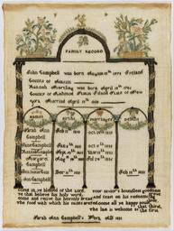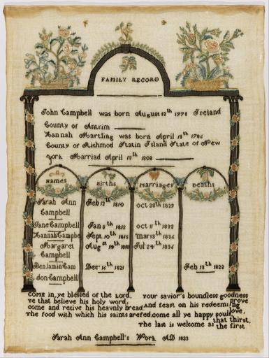 | Keywords: Sarah Ann Campbell - Family register sampler - Google Art Project.jpg 1810 1810 Sarah 6818741 Ann Campbell 1810 - 1810 /collection/cooper-hewitt-national-design-museum/artwork/family-register-sampler-sarah-ann-campbell/6854054/ 176736 Sarah Ann Campbell /artist/sarah-campbell/29153159/ 29153159 /collection/cooper-hewitt-national-design-museum/ Cooper-Hewitt National Design Museum 3644669 http //www cooperhewitt org/ /collection/cooper-hewitt-national-design-museum/artwork/family-register-sampler-sarah-ann-campbell/6854054/ 1823 1823 Medium silk and metal thread embroidery on cotton foundationTechnique embroidered in cross stem and satin stitches on plain weave foundation By 1944 Mrs Amory HaskellBy 1944 Parke-Bernet1944 - 1981 Gertrude M Oppenheimer1981 Cooper-Hewitt Museum 565 6854054 False 1823 1981-28-152 http //collection cooperhewitt org/view/objects/asitem/id/176736 Bequest of Gertrude M Oppenheimer Family register sampler 1820 1830 w420 x h565 cm 1823 False 0 751953125 Object family-register-sampler-sarah-ann-campbell Family register sampler f 420 H x W 56 5 x 41 9 cm 22 1/4 x 16 1/2 in Sarah Ann Campbell's Work AD 1823 Medium silk and metal thread embroidery on cotton foundationTechnique embroidered in cross stem and satin stitches on plain weave foundation By 1944 Mrs Amory HaskellBy 1944 Parke-Bernet1944 - 1981 Gertrude M Oppenheimer1981 Cooper-Hewitt Museum special url_id kwFHDYPvBVtTFw PD-old-100-1923 1810 Google Art Project works by Sarah Ann Campbell Textiles in the Cooper “Hewitt Smithsonian Design Museum 1820s samplers Google Art Project works in Cooper-Hewitt Smithsonian Design Museum Family registers 1823 works |