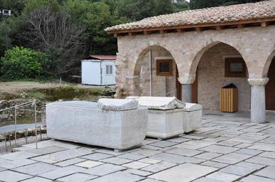 Keywords: Sarkofagi Dafni.jpg pl Dafni obrzeża Aten Pierwszy z widocznych sarkofagów nosi herb rodziny frankońskich książąt de la Roche - ostatnich budowniczych kościoła w Dafni own Dimkoa 2011_01_16 Monastery of Daphni Sarcophagi in Greece