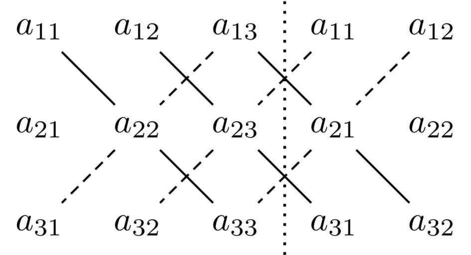 | Keywords: Sarrus rule.svg en Illustration of Sarrus' rule 2012-07-15 own icktoofay Vectorized version of File Sarrus rule png Generated with TikZ and <span class texhtml ><span style font-family cmr10 LMRoman10-Regular Times serif; >L<span style text-transform uppercase; font-size 70 ; margin-left -0 36em; vertical-align 0 3em; line-height 0; margin-right -0 15em; >a</span>T<span style text-transform uppercase; margin-left -0 1667em; vertical-align -0 5ex; line-height 0; margin-right -0 125em; >e</span>X</span></span> Source code <source lang latex > \documentclass minimal \usepackagepapersize 4 8cm 2 6cm margin 0cm geometry \usepackage tikz \pagestyle empty \begin document \raggedright \begin tikzpicture semithick \clip -0 4 -0 3 rectangle 4 4 2 3 ; \foreach \vert in 1 2 3 \foreach \horz/\hnum in 1/1 2/2 3/3 4/1 5/2 \node a\vert-\horz at \horz - 1 3 - \vert a_ \vert\hnum ; \draw a1-1 -- a2-2 a2-2 -- a3-3 a1-2 -- a2-3 a2-3 -- a3-4 a1-3 -- a2-4 a2-4 -- a3-5 ; \draw densely dashed a1-3 -- a2-2 a2-2 -- a3-1 a1-4 -- a2-3 a2-3 -- a3-2 a1-5 -- a2-4 a2-4 -- a3-3 ; \draw thick dotted 2 5 -0 3 -- 2 5 2 3 ; \end tikzpicture \end document </source> cc-zero Uploaded with UploadWizard Sarrus rule Images with LaTeX source code |